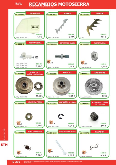 Recambios STH Ref. 503065 MUELLE EMBRAGUE Ref. 504319 TORNILLO CARBURADOR Ref. 503076 PASADOR