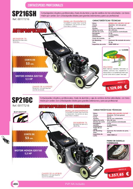 SP216C Cortacéspedes robustos y profesionales, chasis de aluminio y caja de cambios de tres velocidades con trans-