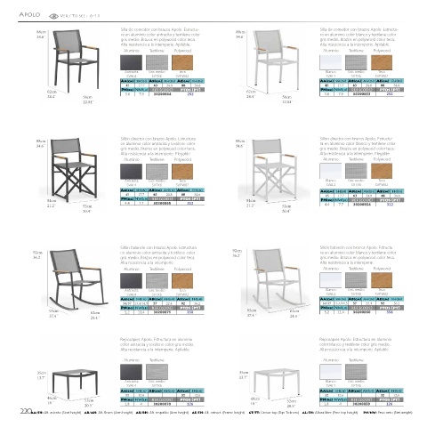 220 AA/SH: Alt. asiento (Seat height) AB/AH: Alt. Brazo (Arm height) AR/BH: Alt. respaldo (Arm height) AE/FH: Alt. estruct. (Frame height) GT/TT: Grosor top (Top Tickness) AL/FH: Altura libre (Free top height) PN/NW: Peso neto (Net weight)