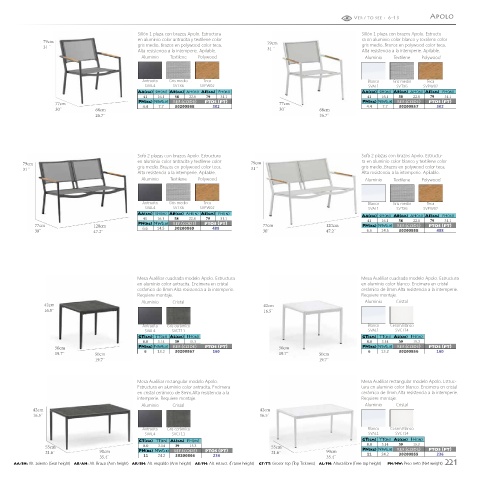 AA/SH: Alt. asiento (Seat height) AB/AH: Alt. Brazo (Arm height) AR/BH: Alt. respaldo (Arm height) AE/FH: Alt. estruct. (Frame height) GT/TT: Grosor top (Top Tickness) AL/FH: Altura libre (Free top height) PN/NW: Peso neto (Net weight) 221