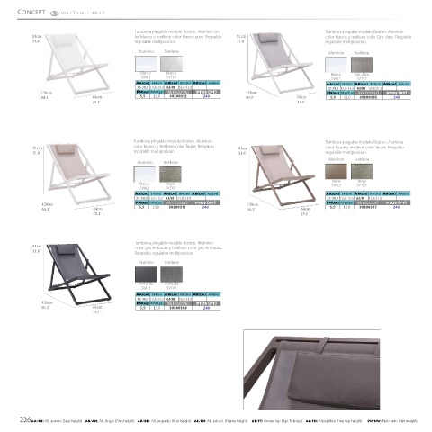 226 AA/SH: Alt. asiento (Seat height) AB/AH: Alt. Brazo (Arm height) AR/BH: Alt. respaldo (Arm height) AE/FH: Alt. estruct. (Frame height) GT/TT: Grosor top (Top Tickness) AL/FH: Altura libre (Free top height) PN/NW: Peso neto (Net weight)