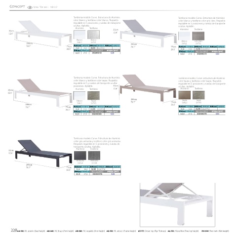 228 AA/SH: Alt. asiento (Seat height) AB/AH: Alt. Brazo (Arm height) AR/BH: Alt. respaldo (Arm height) AE/FH: Alt. estruct. (Frame height) GT/TT: Grosor top (Top Tickness) AL/FH: Altura libre (Free top height) PN/NW: Peso neto (Net weight)