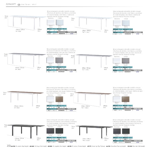 232 AA/SH: Alt. asiento (Seat height) AB/AH: Alt. Brazo (Arm height) AR/BH: Alt. respaldo (Arm height) AE/FH: Alt. estruct. (Frame height) GT/TT: Grosor top (Top Tickness) AL/FH: Altura libre (Free top height) PN/NW: Peso neto (Net weight)