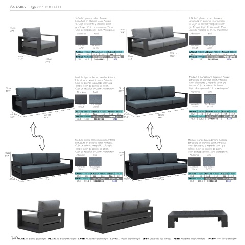 240 AA/SH: Alt. asiento (Seat height) AB/AH: Alt. Brazo (Arm height) AR/BH: Alt. respaldo (Arm height) AE/FH: Alt. estruct. (Frame height) GT/TT: Grosor top (Top Tickness) AL/FH: Altura libre (Free top height) PN/NW: Peso neto (Net weight)