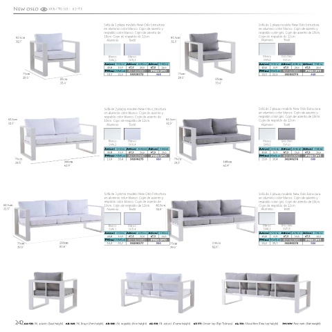 242 AA/SH: Alt. asiento (Seat height) AB/AH: Alt. Brazo (Arm height) AR/BH: Alt. respaldo (Arm height) AE/FH: Alt. estruct. (Frame height) GT/TT: Grosor top (Top Tickness) AL/FH: Altura libre (Free top height) PN/NW: Peso neto (Net weight)