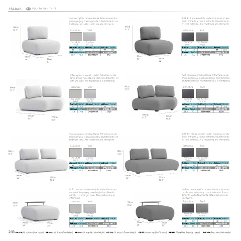 246AA/SH: Alt. asiento (Seat height) AB/AH: Alt. Brazo (Arm height) AR/BH: Alt. respaldo (Arm height) AE/FH: Alt. estruct. (Frame height) GT/TT: Grosor top (Top Tickness) AL/FH: Altura libre (Free top height) PN/NW: Peso neto (Net weight)