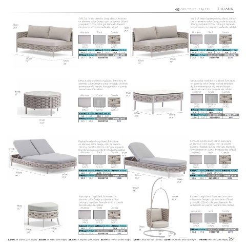 AA/SH: Alt. asiento (Seat height) AB/AH: Alt. Brazo (Arm height) AR/BH: Alt. respaldo (Arm height) AE/FH: Alt. estruct. (Frame height) GT/TT: Grosor top (Top Tickness) AL/FH: Altura libre (Free top height) PN/NW: Peso neto (Net weight) 261